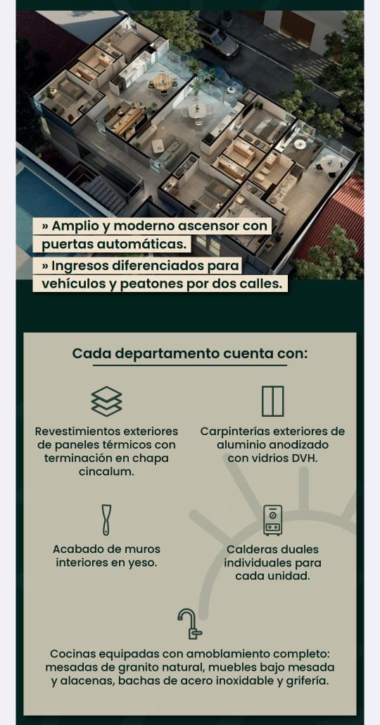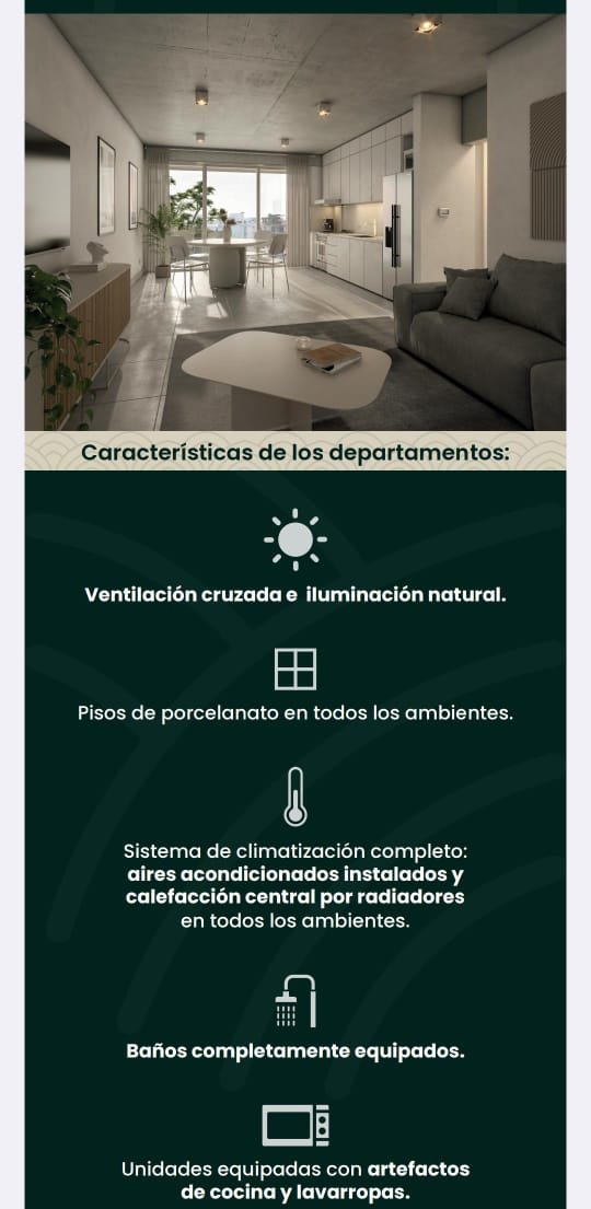Se entrega completamente equipado: caldera y radiadores para calefacción eficiente ♨️, cocina instalada 🍽️, lavarropas 🧺, aires acondicionados (según tipología) ❄️ y cortinas blackout 🖤. Todo con garantía y excelente posventa ✅.